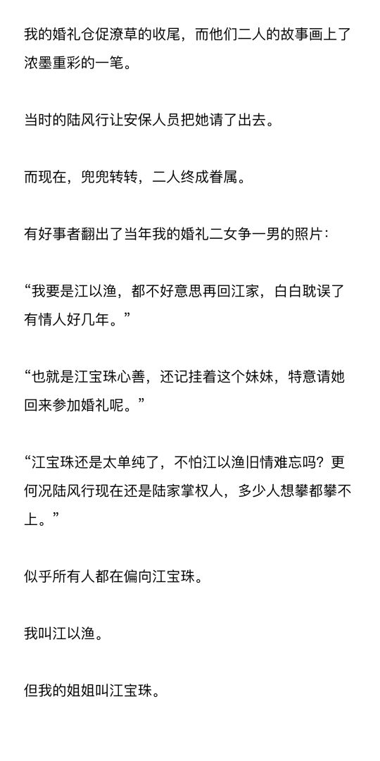 放出的婚纱照里,我的姐姐江宝珠一脸幸福,而我的前夫陆风行笑得宠溺。
