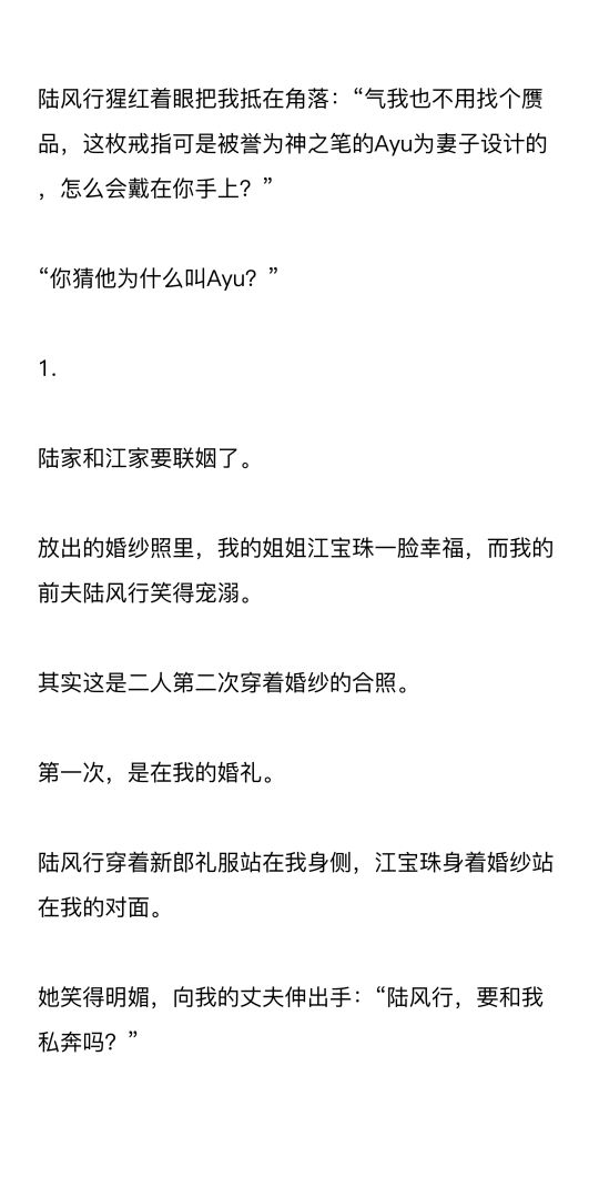 陆风行猩红着眼把我抵在角落:“气我也不用找个赝品,这枚戒指可是被誉为神之笔的Ayu为妻子设计的,怎么会戴在你手上?”