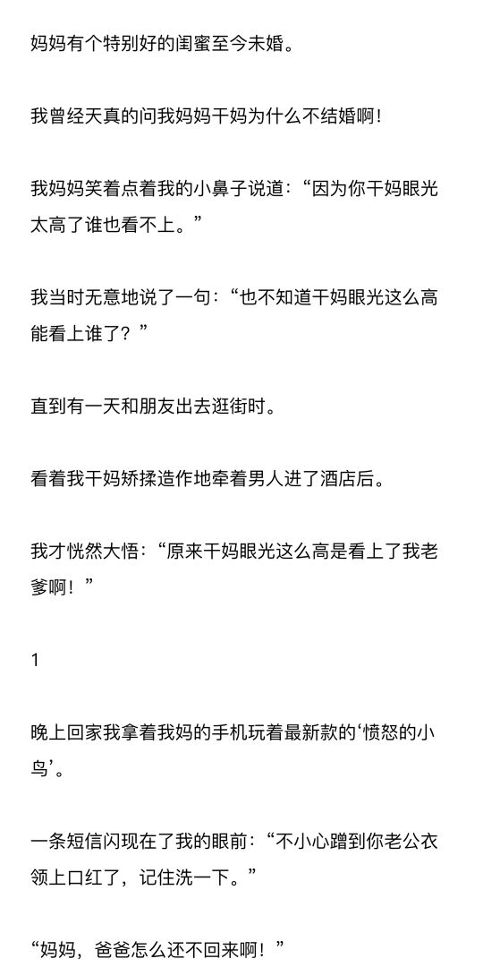 我妈妈笑着点着我的小鼻子说道:“因为你干妈眼光太高了谁也看不上。”