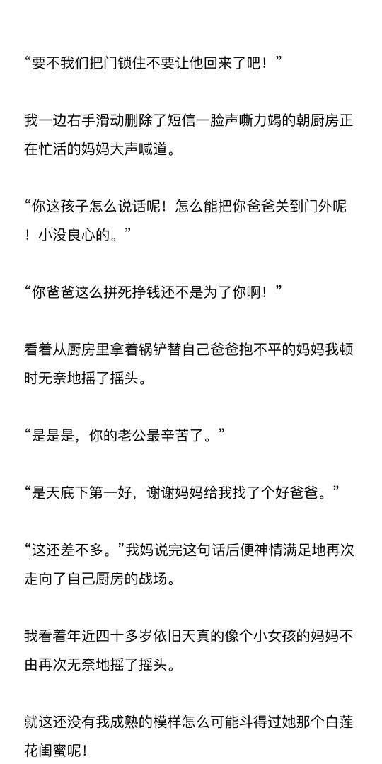 我看着年近四十多岁依旧天真的像个小女孩的妈妈不由再次无奈地摇了摇头。