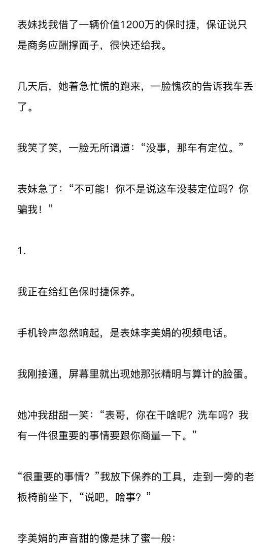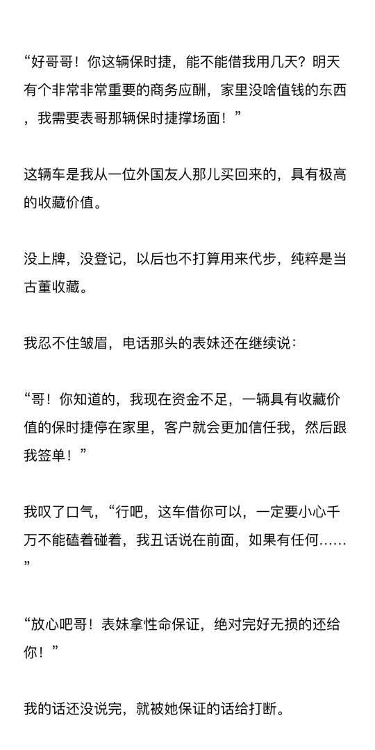 “好哥哥!你这辆保时捷,能不能借我用几天?明天有个非常非常重要的商务应酬,家里没啥值钱的东西,我需要表哥那辆保时捷撑场面!”